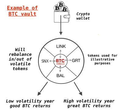 Volatility Vaults(VV) are automated, non-custodial, decentralized applications utilizing a proprietary methodology to dynamically build and rebalance a basket of the most volatile cryptos in order to accumulate more BTC, ETH, USD, etc.